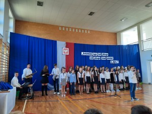 Druga część obchodów święta Patrona miała miejsce w szkole. Rozpoczęło ją poświęcenie nowej hali sportowej. Następnie odbyła się akademia w wykonaniu uczniów i nauczycieli. Uwaga skupiona była przede wszystkim na refleksji dotyczącej duchowego testamentu naszego Rodaka – w jaki sposób możemy go naśladować. Montaż słowno – muzyczny został podzielony na pięć odsłon: I. Matka. Miłość, II. Szkoła. Radość tworzenia, III. Studia. Mogę być kimś, IV. Ojczyzna. Służba, V Jestem z Wami… Zgromadzeni mogli wysłuchać wierszy Konstantego Ildefonsa Gałczyńskiego, Juliana Tuwima, Wisławy Szymborskiej, Adama Asnyka, ks. Jana Twardowskiego, Marii Konopnickiej. Wszystkich urzekły piosenki śpiewane przez szkolny chór i solistki. Niezwykłe wrażenie wywarł również występ Pani Anny Błaszczak, która – rozpoczynając akademię – zachęcała w piosence, abyśmy nauczyli się żyć obok siebie…